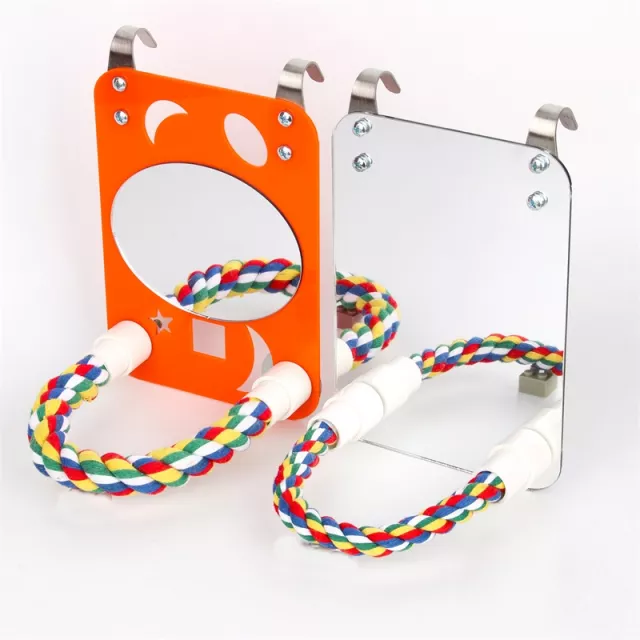 Crafted from high-quality acrylic and metal, this bird toy is built to last. The sturdy cotton rope perch is both comfortable for your bird to grip and durable enough to withstand chewing. The metal hooks make installation simple – just attach it to your bird’s cage and let the fun begin. With a mirror size of approximately 5 x 7 inches and a total toy size of 5 x 5.5 x 7.5 inches, it’s a great fit for cages of many sizes and can accommodate up to three small birds at once.
