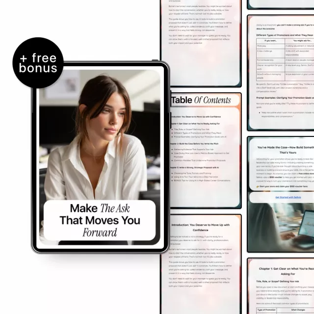 Ready to take control of your career and ask for the promotion you deserve? Make the Ask That Moves You Forward is a comprehensive eBook designed to guide you, step by step, through creating a winning promotion proposal. With practical strategies, real-world examples, and AI-powered tips, this digital download shows you exactly how to use AI to create a promotion proposal that highlights your achievements, demonstrates your value, and positions you for success.