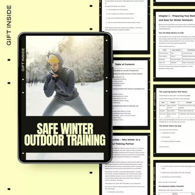 Safe Winter Outdoor Training is a practical, no-fluff ebook designed to help you train outside confidently when temperatures drop and conditions get challenging. Winter doesn’t have to mean stopping your routine or risking injury. This guide shows you how to use cold weather as a training advantage while staying smart, prepared, and consistent. Whether you’re new to cold-weather fitness or looking to refine your approach, this ebook gives you clear systems you can apply immediately.