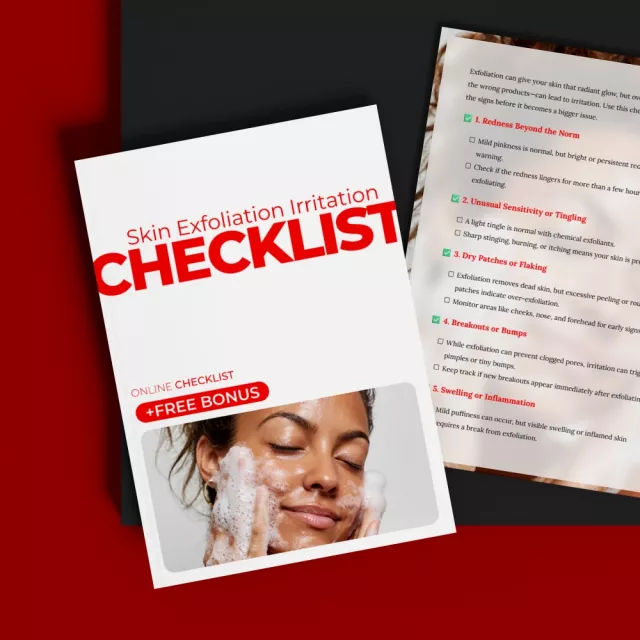 Don’t let irritation or breakouts disrupt your glow. Download the Skin Exfoliation Irritation Checklist today and ensure your skin stays healthy and radiant. Whether you’re using chemical exfoliants or physical scrubs, this checklist will guide you through the signs of over-exfoliation, so you can make sure your skincare routine is working for you, not against you.