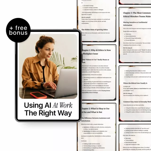 Artificial intelligence is transforming how we work, but with great power comes great responsibility. Using AI at Work the Right Way is your comprehensive guide to understanding the workplace ethics of AI use. This eBook helps professionals, teams, and managers navigate the challenges of AI adoption responsibly, ensuring speed and efficiency never come at the cost of ethics or accountability. Packed with practical advice, clear guidelines, and actionable checklists, it’s the essential resource for anyone looking to integrate AI thoughtfully and safely into their daily work.