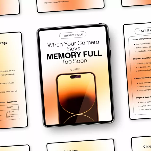 Nothing kills creative momentum faster than seeing “memory full” in the middle of a shoot. When Your Camera Says “Memory Full” Too Soon is a practical, easy-to-follow digital guide designed to help photographers take back control of their camera storage, streamline their workflow, and shoot with confidence. Whether you’re capturing everyday moments or high-pressure events, this guide shows you exactly why storage fills up so fast—and what to do about it.