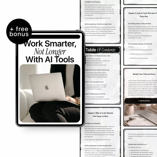 Unlike generic AI guides, this ebook is focused entirely on time savings. It cuts through the noise and shows you how to use AI with intention, clarity, and measurable results, making it one of the most practical resources on ai tools that save time at work.
