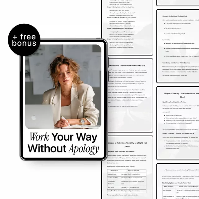 Don’t wait to redefine the way you work. Download Work Your Way Without Apology now and discover how to use AI to ask for a flexible schedule, reclaim your time, and create the work-life balance you deserve!